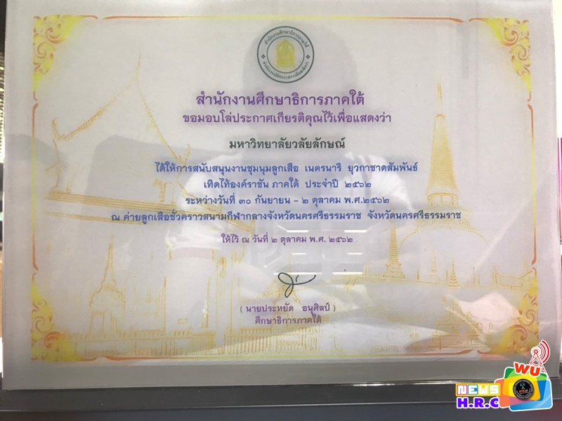 วันที่ 30 – 2 ตุลาคม 2562 ตามที่ได้มีหนังสือขอความอนุเคราะห์จากสำนักงานศึกษาธิการภาค 5 ขอความอนุเคราะห์สนับสนุนเครื่องวิทยุคมนาคมแม่ข่ายและเจ้าหน้าที่ในการจัดงานชุมนุมลูกเสือ เนตรนารี ยุวกาชาดสัมพันธ์ เทิดไท้องค์ราชัน ภาคใต้ ทั้ง 14 จังหวัด จำนวน 1,000 คน ณ สนามกีฬากลางจังหวัดนครศรีธรรมราช มายังท่านอธิการมหาวิทยาลัยวลัยลักษณ์