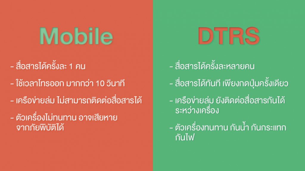 จากข้อมูลด้านล่าง ชี้ให้เห็นว่า นอกจาก DTRS จะมีรูปแบบการใช้งานที่แตกต่างจากวิทยุสื่อสารในแบบเดิมๆ DTRS ยังมีคุณสมบัติพิเศษอีกหลายข้อที่โทรศัพท์มือถือไม่สามารถทดแทนให้ได้ ดังนี้